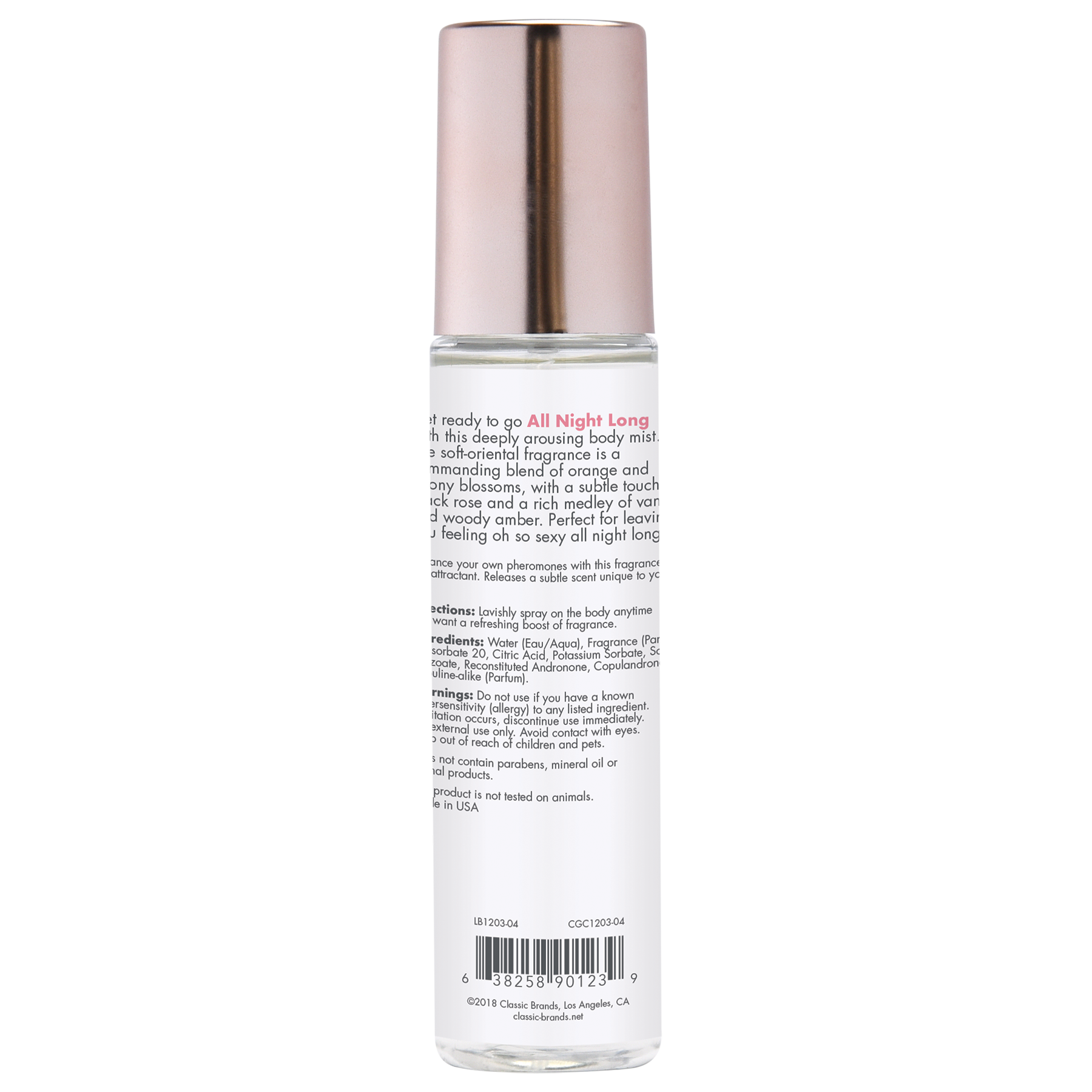 CGC Body Mist with Pheromones All Night Long 3.5 fluid ounces from Classic Erotica. Take control of your pleasure. Spray bottle body mist perfume. Directions: apply perfume to pulse points. Reapply as wanted or desired. Paraben free formula. Not tested on animals. Get ready to go All Night Long with this deeply arousing body mist. The soft oriental fragrance is a commanding blend of Orange and Peony Blossom, with a subtle touch of Black Rose and a rich medley of Vanilla and Woody Amber. Perfect for leaving you feeling oh so sexy all night long. A subtle but rich oriental fragrance. Ideal for turning heads on a special night out or an intimate evening in for two. Top notes Orange, Raspberry and Peony. Middle notes Tropical Orchid, Lychee and Black Rose. Base notes. Dry notes of Sweet Amber, Caramel, Vanilla and Woody Amber. Ingredients Water, Fragrance, Polysorbate 20, Citric Acid, Potassium Sorbate, Sodium Benzoate, Reconstituted Andronone, Copulandrone, Copuline-alike Perfume. Categories: Erotic Body Lotions, Sprays, Health and Beauty, After Bath. Made in the USA. Restricted, Amazon Restricted. 2023.