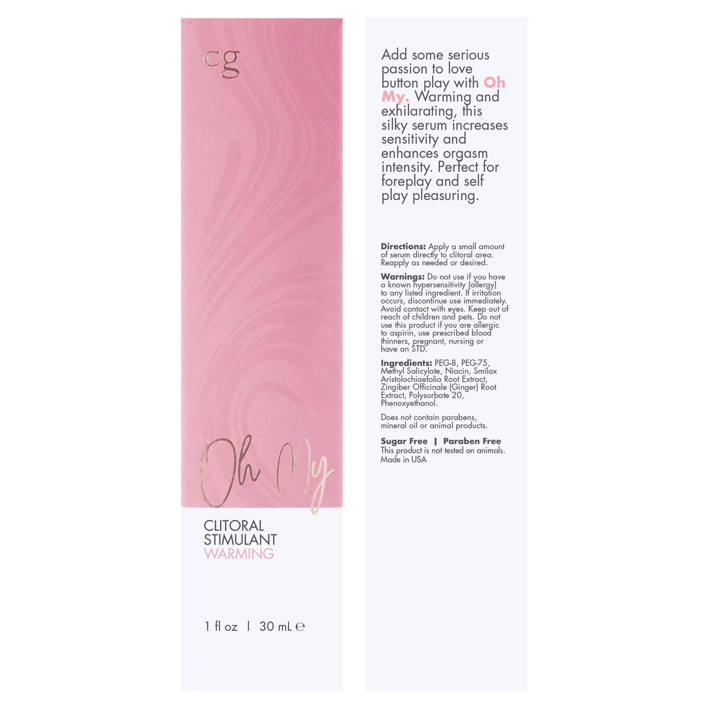 CGC Oh My Clitoral Stimulant Warming 1 fluid ounce from Classic Erotica. Fragrance free. Add some serious passion to love button play with Oh My. Warming and exhilarating, this silky serum increases sensitivity and enhances orgasm intensity. Perfect for foreplay and self play pleasuring. Warming and tingly serum, ideal for clitoral arousal and enhanced sensation. Ideal for toy, self and couple's play. This product does not contain gluten or sugar. This product does not contain parabens or mineral oil. This product is not tested on animals. Ingredients: PEG-8, PEG-75, Methyl Salicylate, Niacin, Smilax Aristolochiaefolia Root Extract, Zingiber Officinale Ginger Root Extract, Polysorbate 20, Phenoxyethanol. How to use: apply a small amount of serum directly to clitoral area. Reapply as needed or desired. Warning: do not use if you have a known hypersensitivity allergy to any listed ingredient. If irritation occurs, discontinue use immediately. Avoid contact with eyes. Keep out of reach of children and pets. Do not use this product if you are allergic to aspirin, use prescribed blood thinners, pregnant, nursing or have an STD. Categories: Erotic Body Lotions, Lubricants, Warming, Tingling, Lotions. Restricted, Amazon Restricted. 2023.