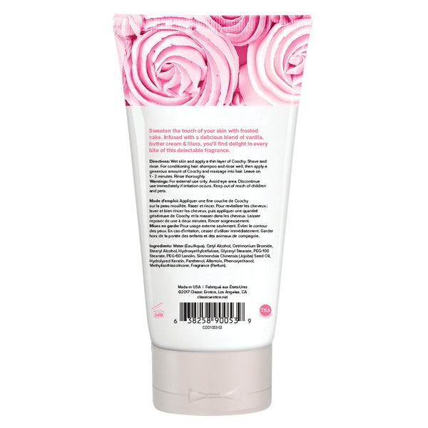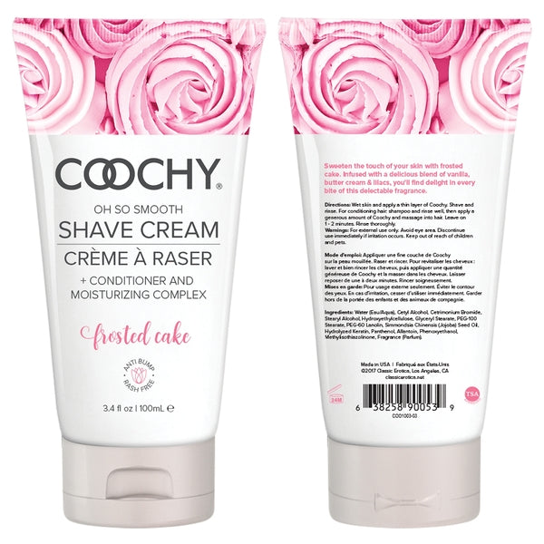 Classic Erotica Coochy Rash Free Shave Cream 3.4 fluid ounces Tube. New fragrance Frosted Cake dramatically reduces cuts, nicks, scrapes and razor irritation. It contains a special conditioner and moisturizing complex that provides an effortless glide for an oh so smooth shave. Your coochy will love you for it! Why it is different the conditioner and moisturizing complex provides the perfect lubrication and razor glide. Jojoba Seed Oil provides a protective barrier for skin and helps seal in moisture. Coochy Shave Cream does not contain unnecessary foaming agents. Tip as with any shaving cream, soak skin and exfoliate before shaving. If necessary, follow with an after shave protection mist. Coochy Shave Cream Frosted Cake sweeten the touch of your skin with frosted cake. Infused with a delicious blend of vanilla, butter cream and lilacs, you will find delight in every bite of this delectable fragrance. 3.4 ounce tube. Ingredients: Water, Cetyl Alcohol, Cetrimonium Bromide, Stearyl Alcohol, Hydroxyethylcellulose, Glyceryl Stearate, PEG-100 Stearate, PEG-60 Lanolin, Simmondsia Chinensis Jojoba Seed Oil, Hydrolyzed Keratin, Panthenol, Allantoin, Phenoxyethanol, Methylisothiazolinone, Fragrance/Parfum Coochy Shave Cream Frosted Cake 3.4 fluid ounces. Directions: wet skin and apply a thin layer of Coochy. Shave and rinse. For conditioning hair: shampoo and rinse well, then apply a generous amount of Coochy and massage into hair. Leave on 1-2 minutes. Rinse thoroughly. Made in the USA. Categories: Erotic Lotions, Cream, Shave Creams, Health and Beauty, Shaving, Personal Grooming, Hygiene, Intimate Care, Health and Beauty, Shaving, Personal Grooming, Hygiene, Intimate Care. Restricted, Amazon Restricted. 2023.