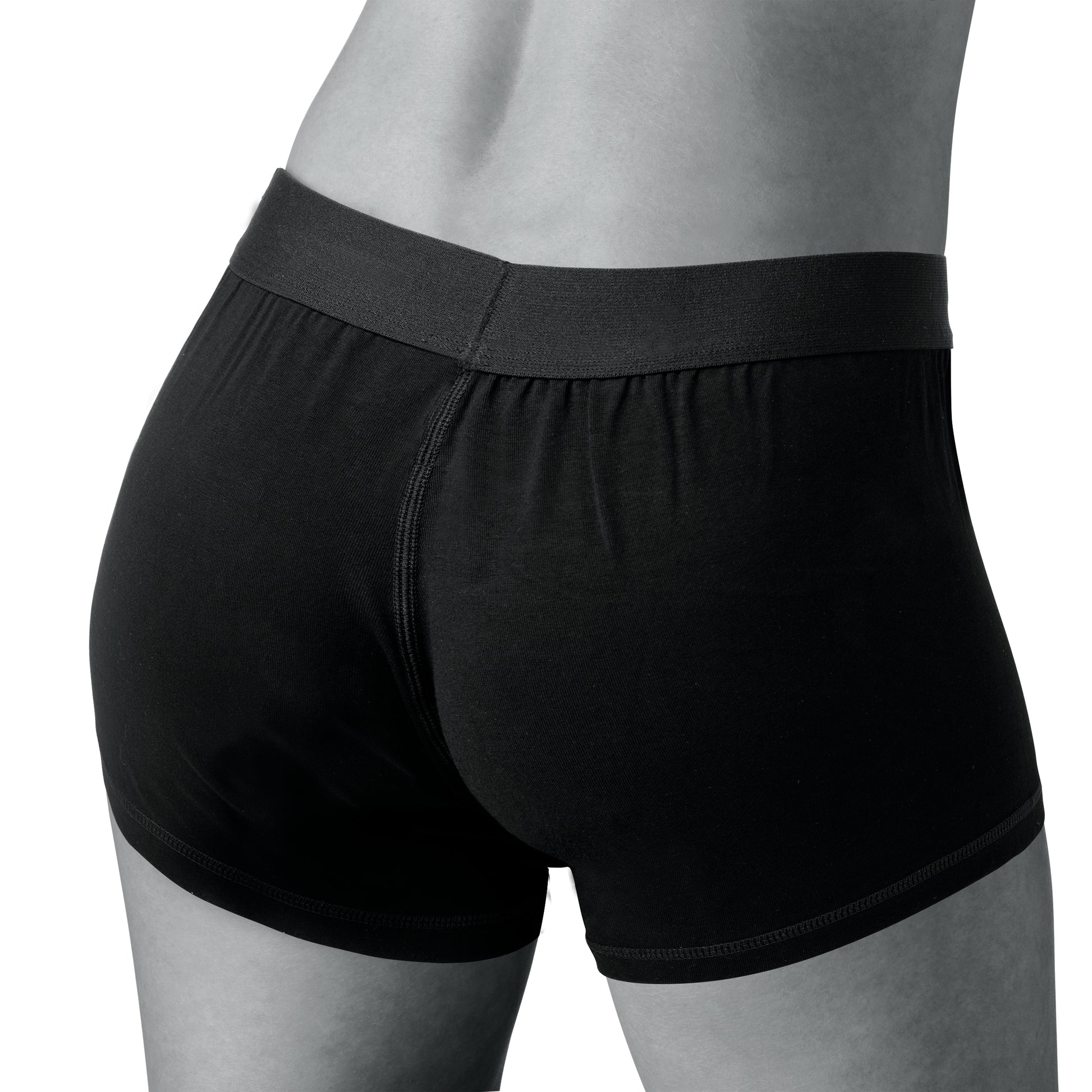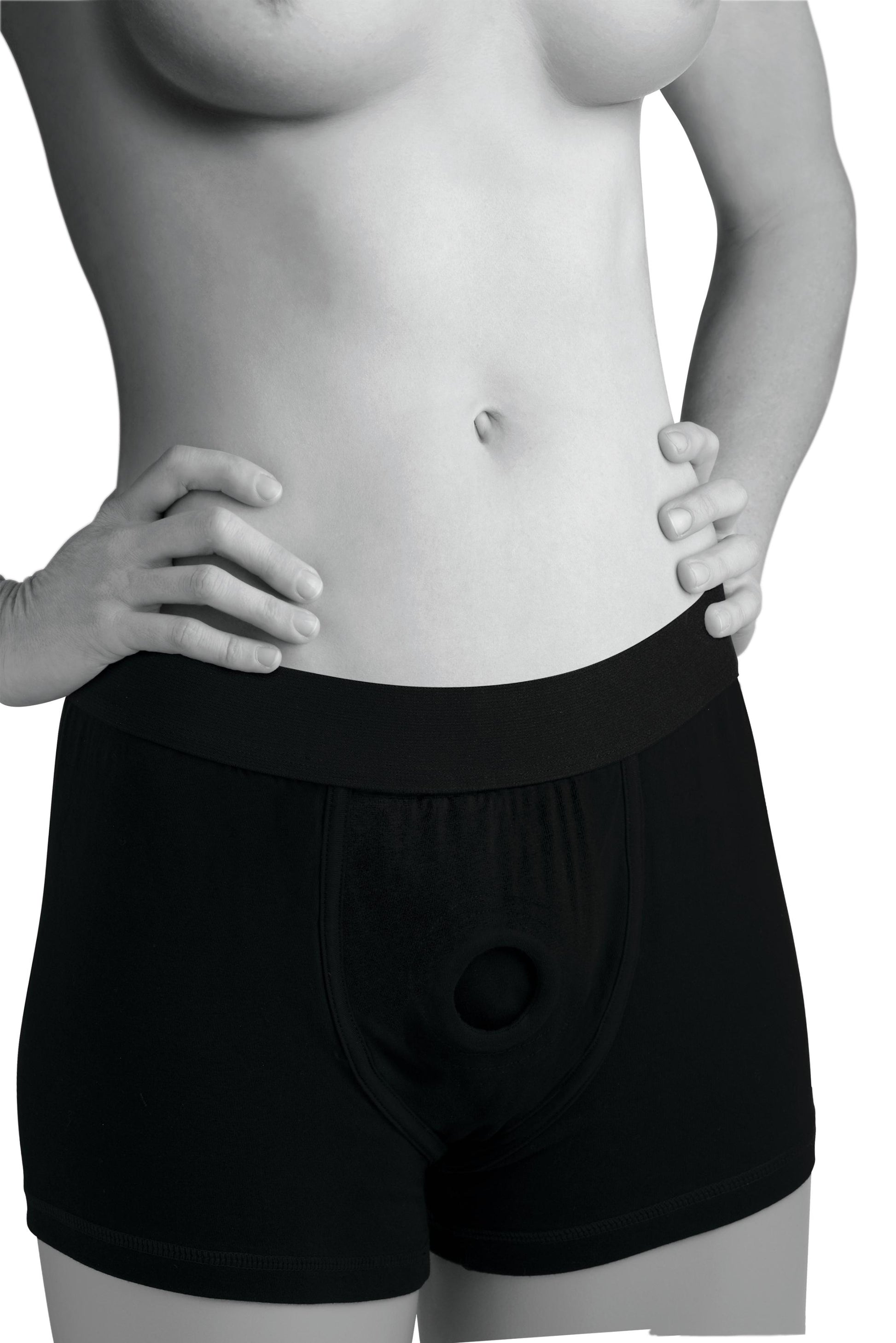 Feel more comfortable and stylish than ever before when you strap on your favorite dildo. This boxer brief style harness feels just like underwear, with an O-ring that stretches to accommodate most dildo sizes. You can even wear these cotton shorts out under your clothing, or stuff them with your favorite packer. This harness is excellent for extended wear. The supportive elastic waistband will carry the weight of your dong and you will be allowed greater mobility and position versatility. This harness is recommended for use with dildos that have a flat base that is 1.75 inches or wider.