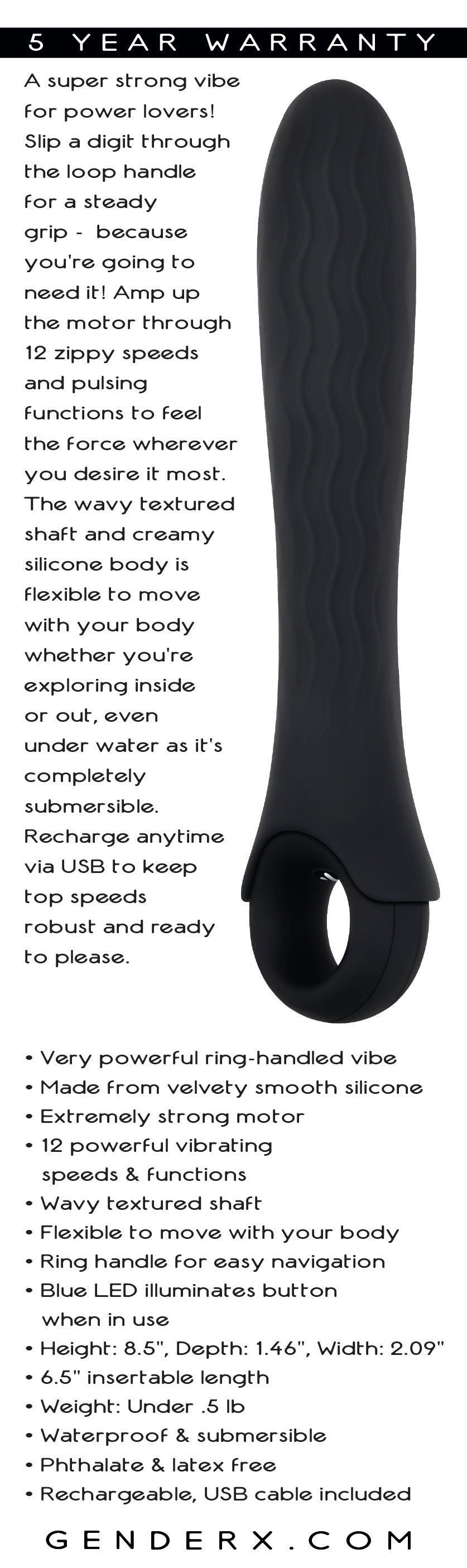 A super strong vibe for power lovers! Slip a digit through the loop handle for a steady grip - because you're going to need it! Amp up the motor through 12 zippy speeds and pulsing functions to feel the force wherever you desire it most. The wavy textured shaft and creamy silicone body is flexible to move with your body whether you're exploring inside or out, even under water as it's completely submersible. Recharge anytime via USB to keep top speeds robust and ready to please.